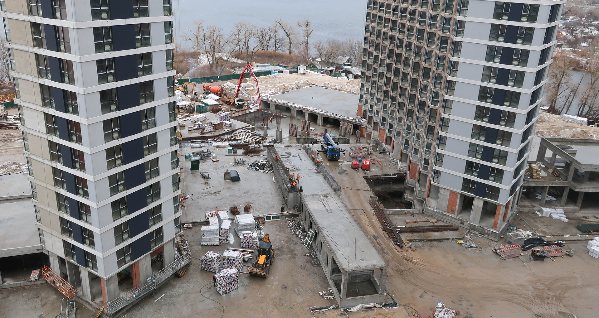 У будинку 7 продовжуються роботи з утеплення фасаду та монтажу кронштейнів під кондиціонери. Виконуються внутрішні інженерні роботи та роботи в місцях загального користування: оздоблення стін та підлоги.