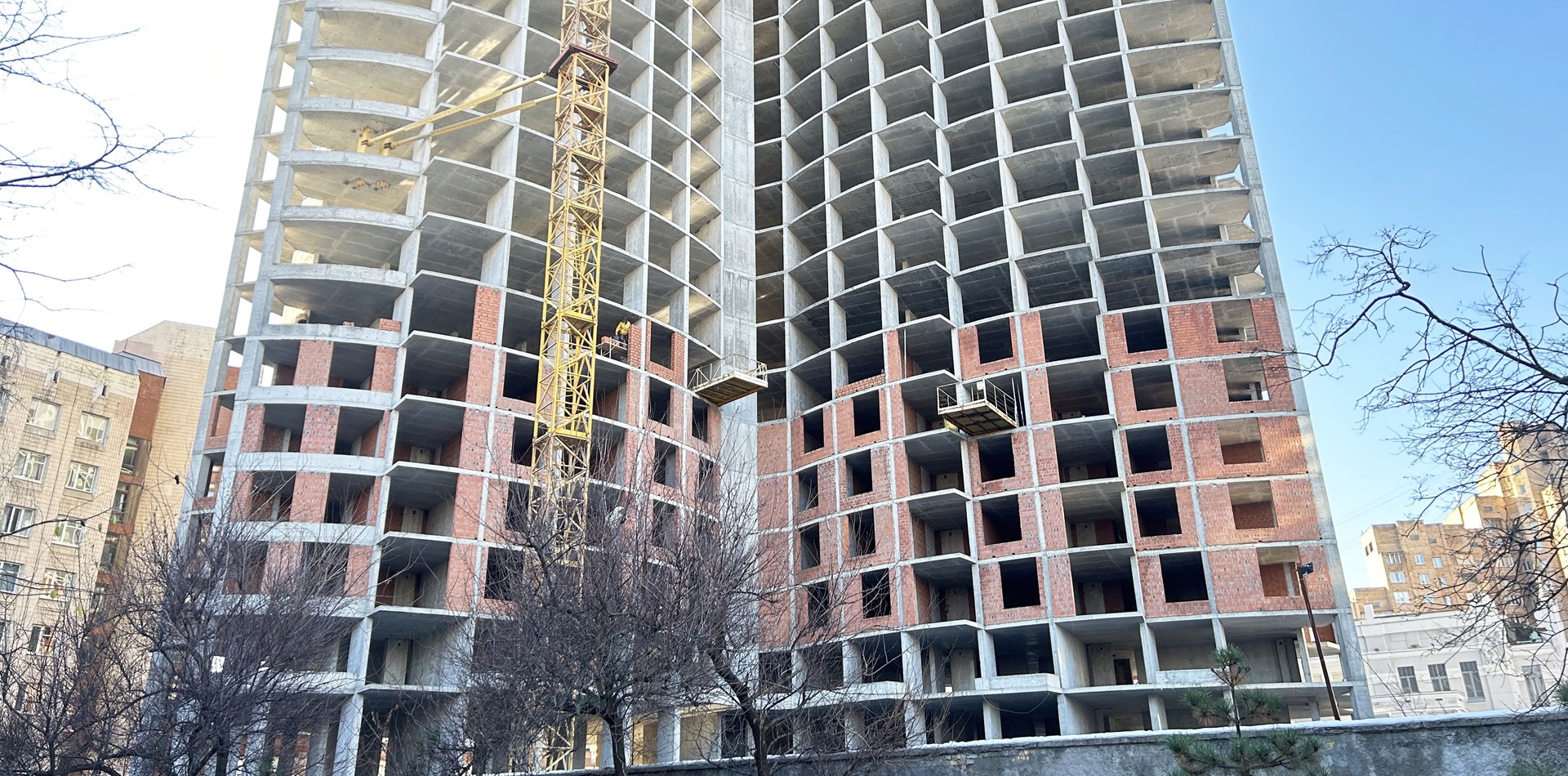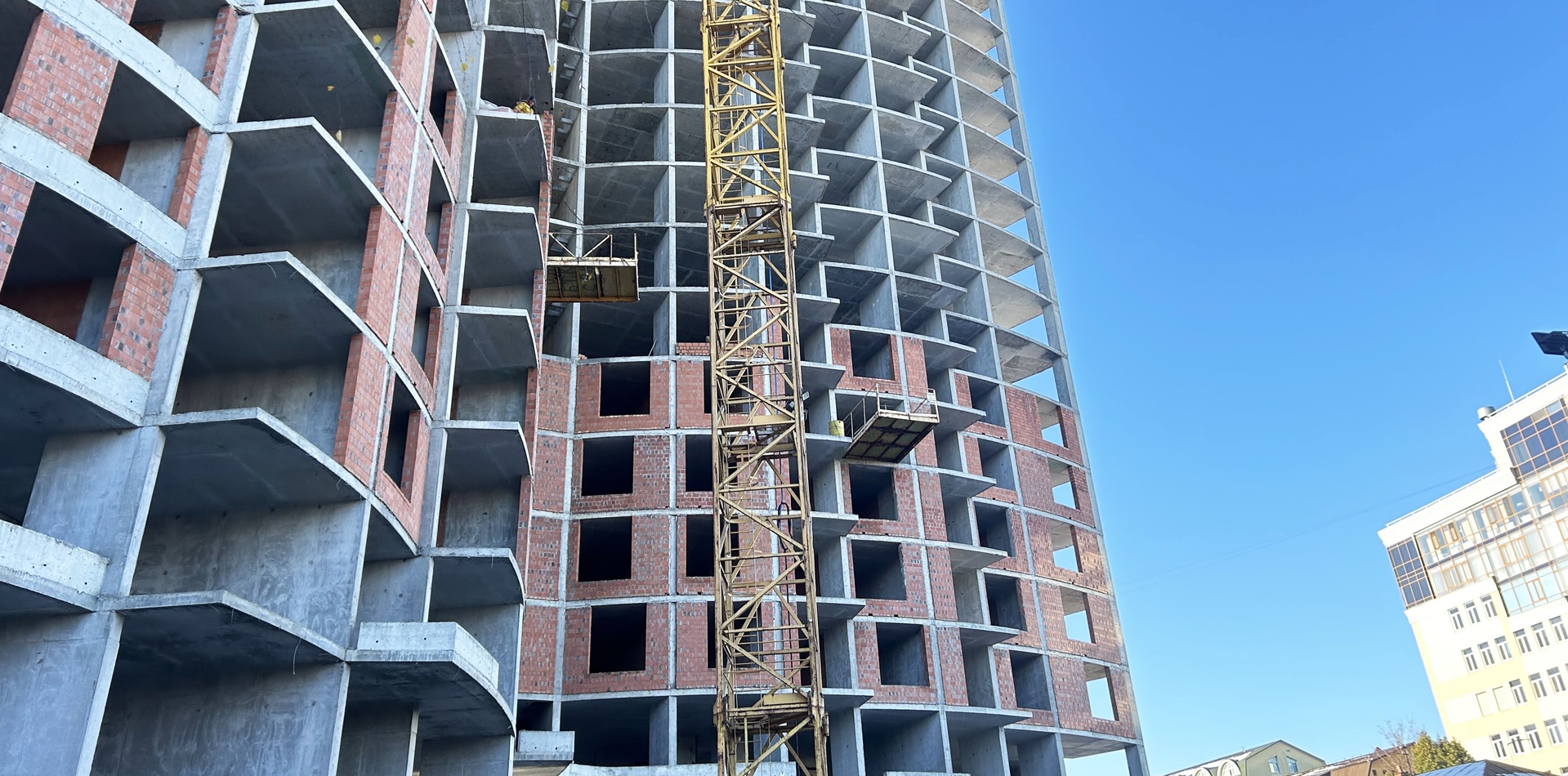 Роботи з цегляної кладки виконуються на рівні 7-го поверху. На 6-му поверсі роботи з цегляної кладки - виконані.